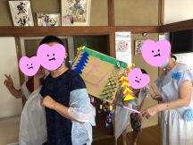 自分達で夏祭りの飾り、おみこし、はっぴを作りました。