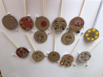 利用者一人一人が、絵を描き、色を塗り、世界に一つだけのでんでんだいこの完成です。