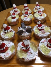 午前中は、イチゴを使ってミニサンタのケーキを作りました。