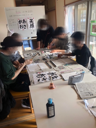 日頃使い慣れていない筆を持ち、筆を使い、職員の