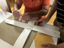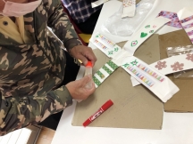 作り始めるとすぐ「牛乳パック切れな〜い!」「まっすぐ切るのむずかしい〜!」と苦戦していましたが、「ゆっくりでいいから頑張って切ってね!」と声かけをして見守ると皆さん一生懸命牛乳パックを切り、次の工程である色がみの切り貼りや絵を描いたりして熱心に行っていました。